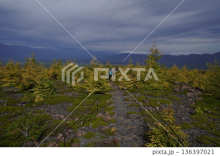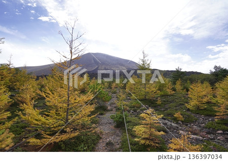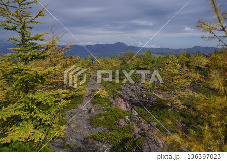 群馬県浅間山 スカイロックトレイルの吾妻火砕流上を通過中の景色 背景に浅間山2025年10月18日