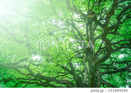 新緑の森を見上げる、欅の巨樹