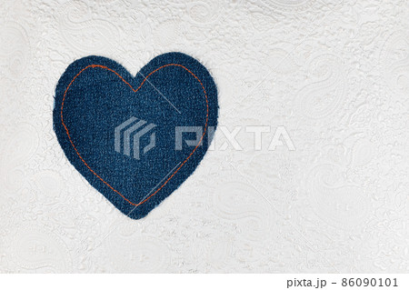 Denim fabric patch lies on the white leather. Top view.
