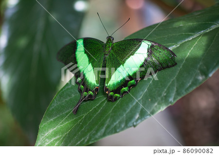 Beautiful green butterfly sitting on a green leaf.