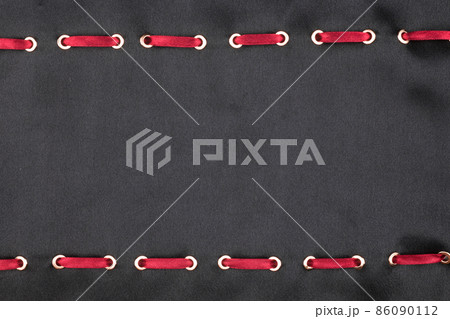 Red satin ribbon inserted into golden rings on black silk. Top view.