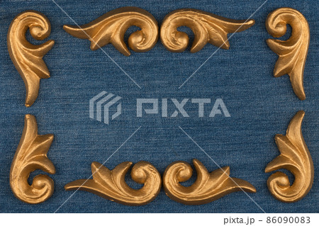 Beautiful decor of gold stucco molding on denim. Top view.