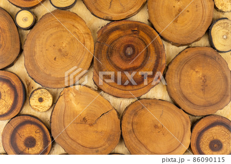 Wooden decorative panel made from round cuts of wood