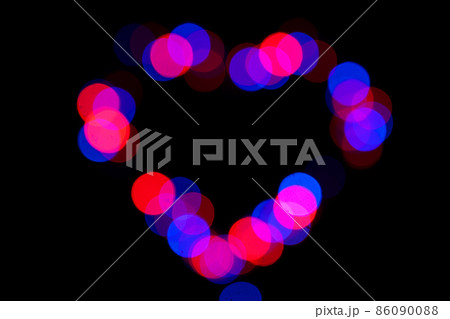 Festive background of multicolored bokeh in the shape of a heart. Abstract blurred colored lights.