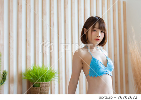 Portrait of young pretty sexy Asian woman wearing blue bikini in her room.