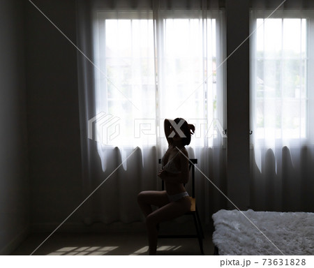 Portrait of young pretty sexy Asian woman wearing white bikini in her room.