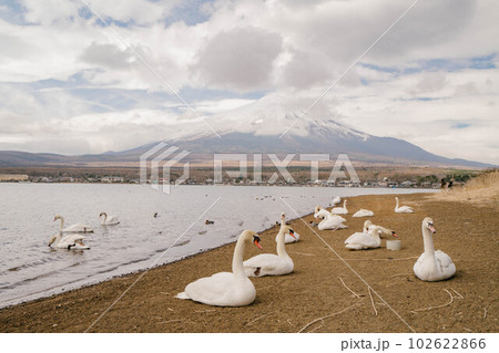 Mt. fuji in morning at lake yamanaka with swan, Yamanakako, Japan.