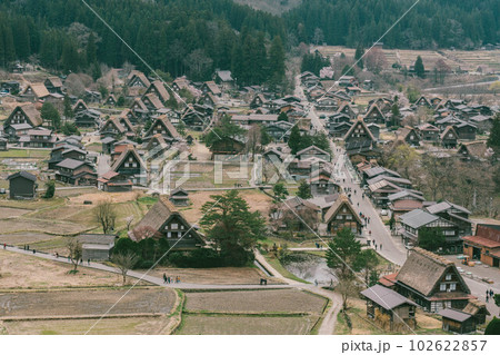 Sakura Cherry blossom branch with Shirakawago village background in spring season