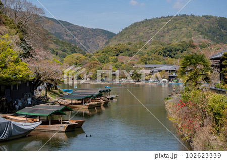 Boats in Katsura River in Arashiyama district with cherry blossom in spring time