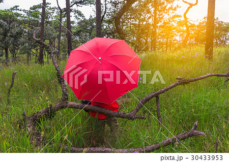 Woman with red umbrella in nature on background.