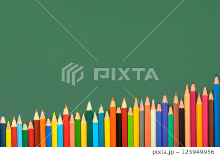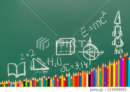 wreath of multicolored pencils on green chalkboard background, top view, copy space, back to school concept
