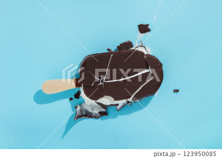 chocolate popsicle with ice cream and hard shadow on blue background, creative decoration of summer concept