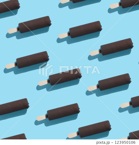 trendy seamless pattern of chocolate popsicle with ice cream and hard shadow on blue background, creative decoration of summer concept