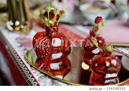 A table decorated with a path with grenades. Oriental, Arabic theme. Wedding decoration in ethnic style