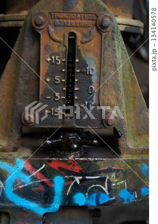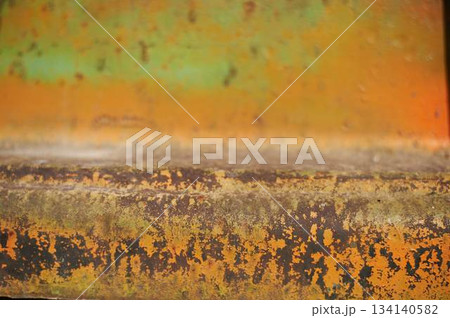Paint on rusty metal. Rough style, background image. Railway, graffiti.