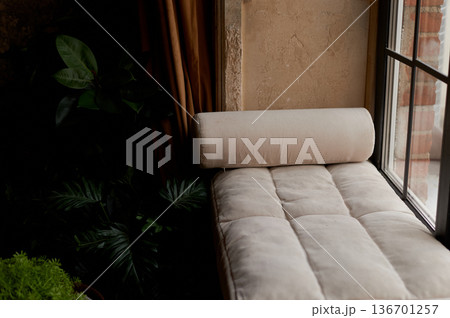 A cozy window sill in the winter garden with a pillow roller, a classic palace interior. Palm trees and greenery