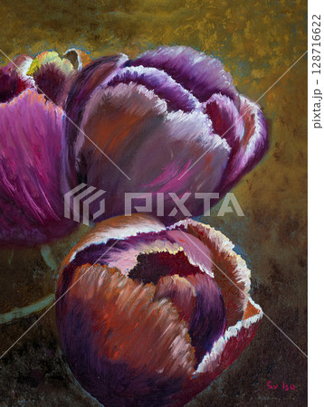 Tulips in handmade oil painting. Closeup of blooming parrot tulips painted in rich purples, reds, oranges on textured canvas. Concept of floral elegance, natural beauty, springtime vibrancy