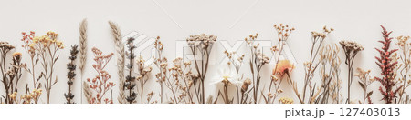 Vintage herbarium. Composition of pressed dried graceful meadow flowers on light paper background