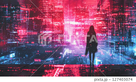 Lonely woman standing top of skyscraper, neon panorama, futuristic cityscape, digital data streams, cyberpunk, matrix