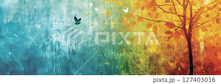Autumn leaves in vibrant vase painted in expressive mixed media with splashes, textures, and flowing lines. Concept of autumn mood, seasonal nostalgia, inner transformation awareness