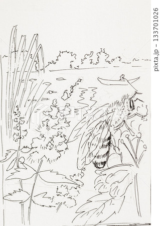 Hand drawn sketch, ink illustration of bee on wildflowers near a river with boat in distance, summer nature. Concept of harmony between nature, pollinators, peaceful human presence