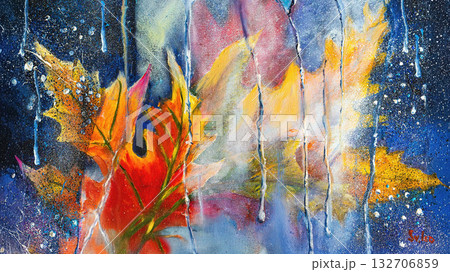 Abstract Autumn Leaf Painting. Vivid composition featuring bright autumn leaves, paint rain drips and bold textures on canvas, expressive style. Concept of autumn, abstract art, creative impressionism