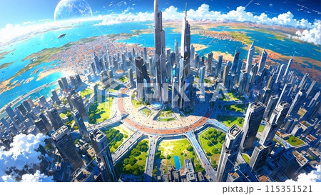 Sci-fi cityscape at sunny day. Futuristic metropolis. AI generated illustration