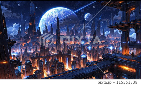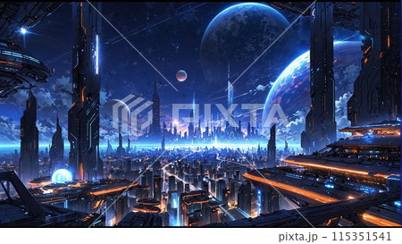 Sci-fi cityscape at night. Futuristic metropolis. AI generated illustration