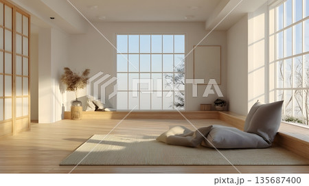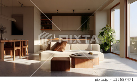 Japandi inspired studio apartment interior 3D render soft tone eco clean