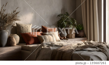 Earth palette studio interior bright sunlight minimal clean arrangement