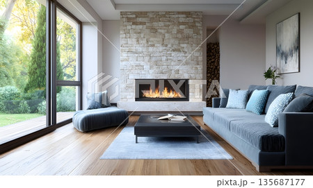 Cozy modern living room wide view fireplace sofa open space for text overlay