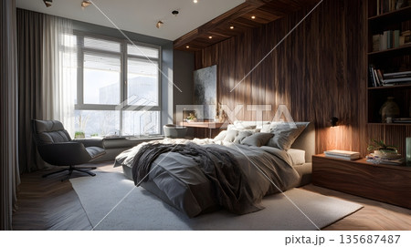 Textured eco wood interior studio apartment soft glow relaxed empty space