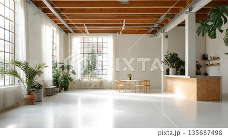 Minimal white and wood studio interior natural light simple fresh atmosphere