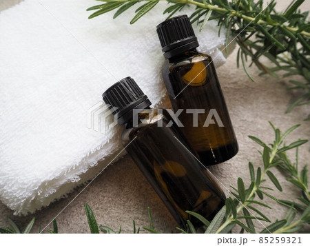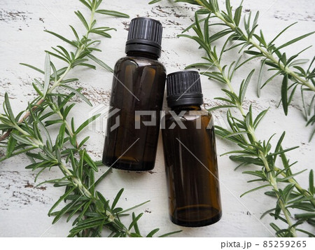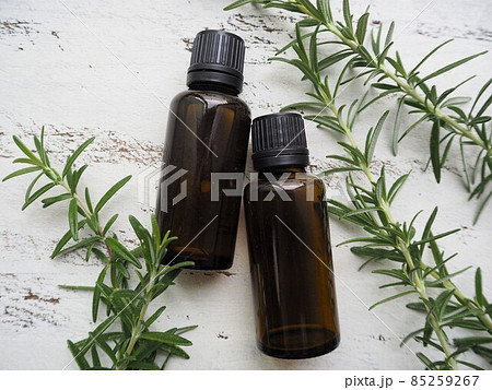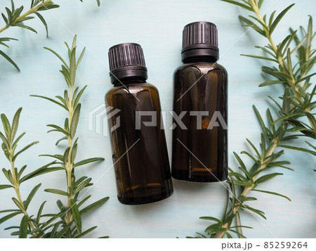 2本のアロマオイルボトルとローズマリーの葉
