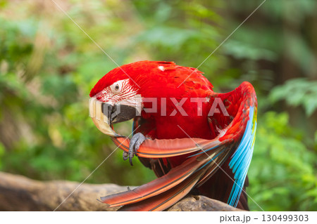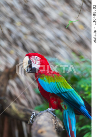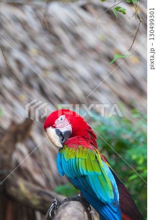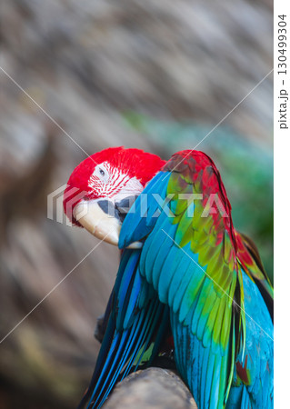 A close-up of colorful macaw bird face at a zoo with a browm background