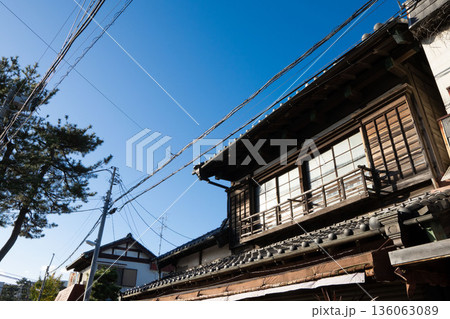 江戸時代の名残のある和風建築、置き屋さんのような二階建て木造建築