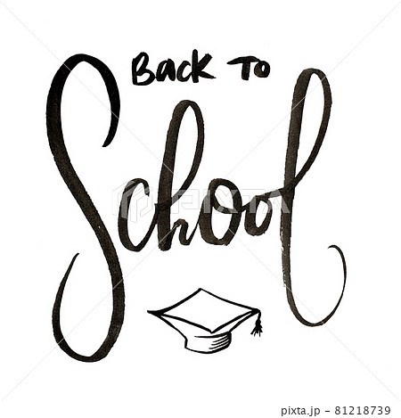 Brush pen raster calligraphy Back to School. Textured watercolour illustration with graduation cap isolated on white.