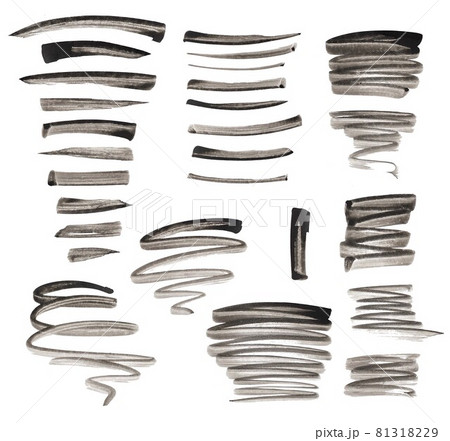 Set of high-resolution raster shapes. Hand-drawn black white watercolour curves, lines, strokes.