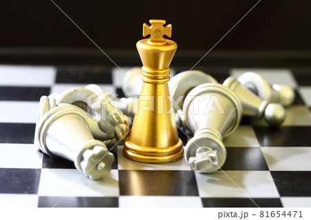 gold King chess surrounded by a number of fallen silver chess pieces , business strategy concept