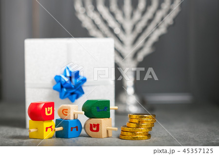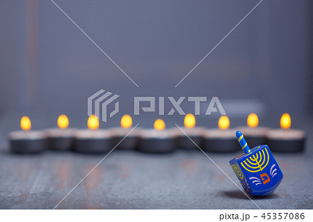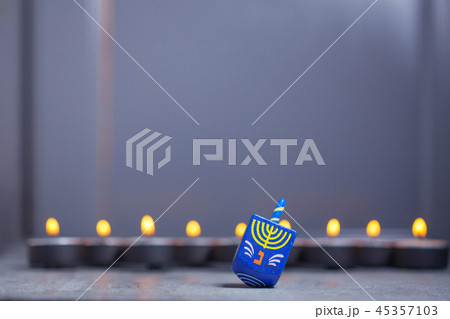 Defocused lights of Jewish holiday Hanukkah and spinning top