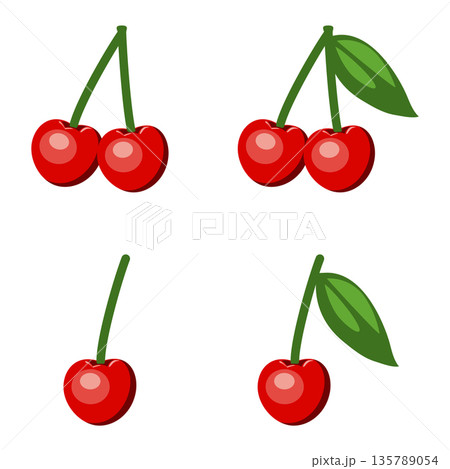 葉ありと葉なしの新鮮な赤いさくらんぼのベクターイラストのセット