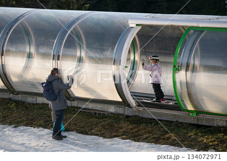 A girl on skis stands on a carpet ski lift in a glass tunel