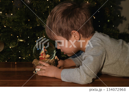 A boy looking at a glass ball with a scene of the birth of Jesus Christ