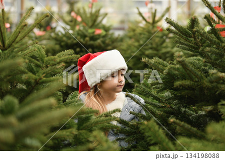 Small girl chooses a Christmas tree in the market.