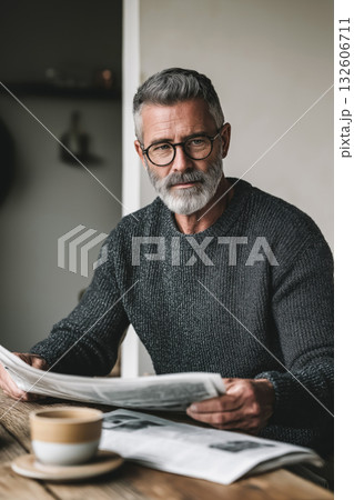 Senior man reading newspaper while enjoying coffee in cozy indoor setting
