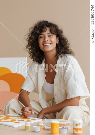 Smiling young woman in yellow sweater poses at table with colorful art background