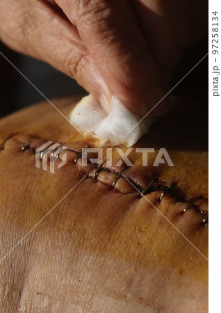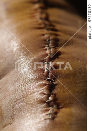 Surgical suture on the knee. Surgical wound sutured with special metal suture for healing. Total knee joint replacement. Close-up.