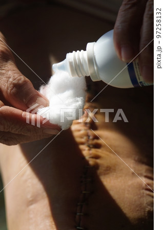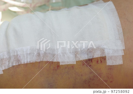 The surgical suture is covered with a gauze dressing. Total knee joint replacement. Close-up.
