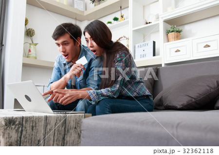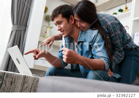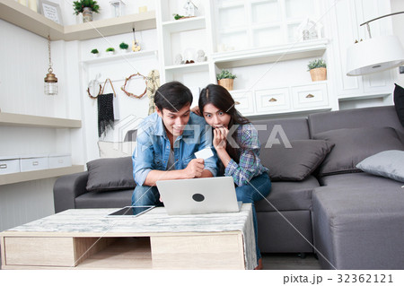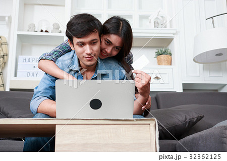Happy couple online shopping at home