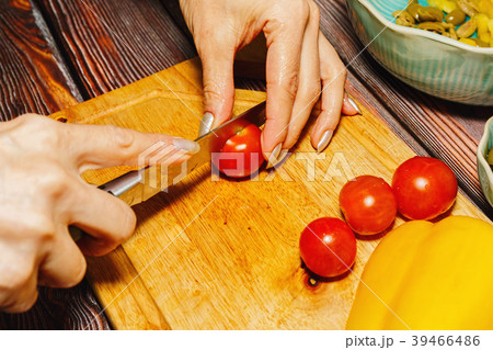 Female person slicing cherry tomatoes